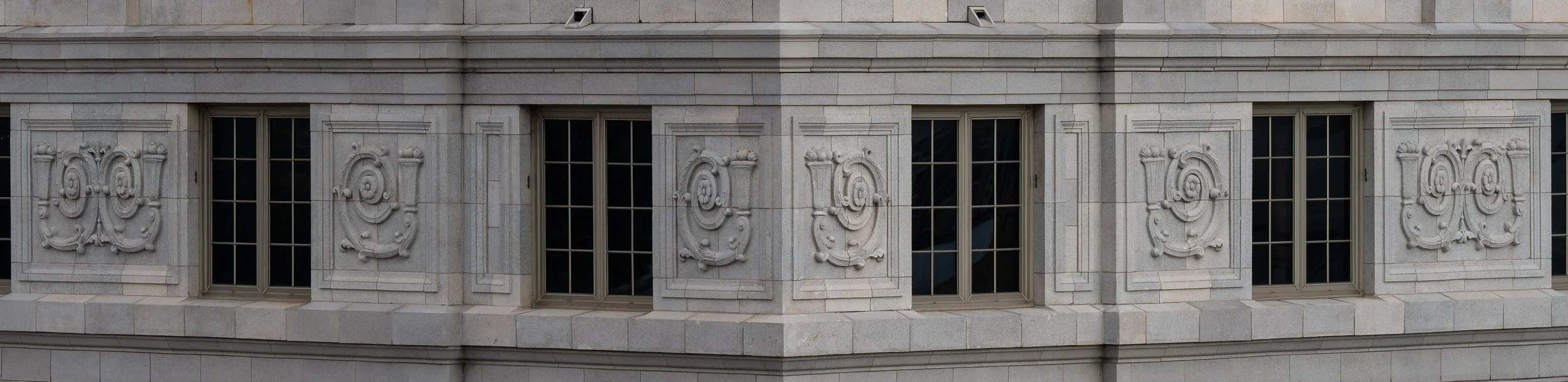 Beginning at the 19th floor, decorative panels with sinuous patterns of acanthus tendrils, leaves, and flowers adorn the frieze of the high rise’s shaft. These embellishments include a rosette at one end and tulip-shaped vase containing flowers on the other. These ornaments, often found in ancient Greek and Roman Grotesque paintings, are placed to fill a void.