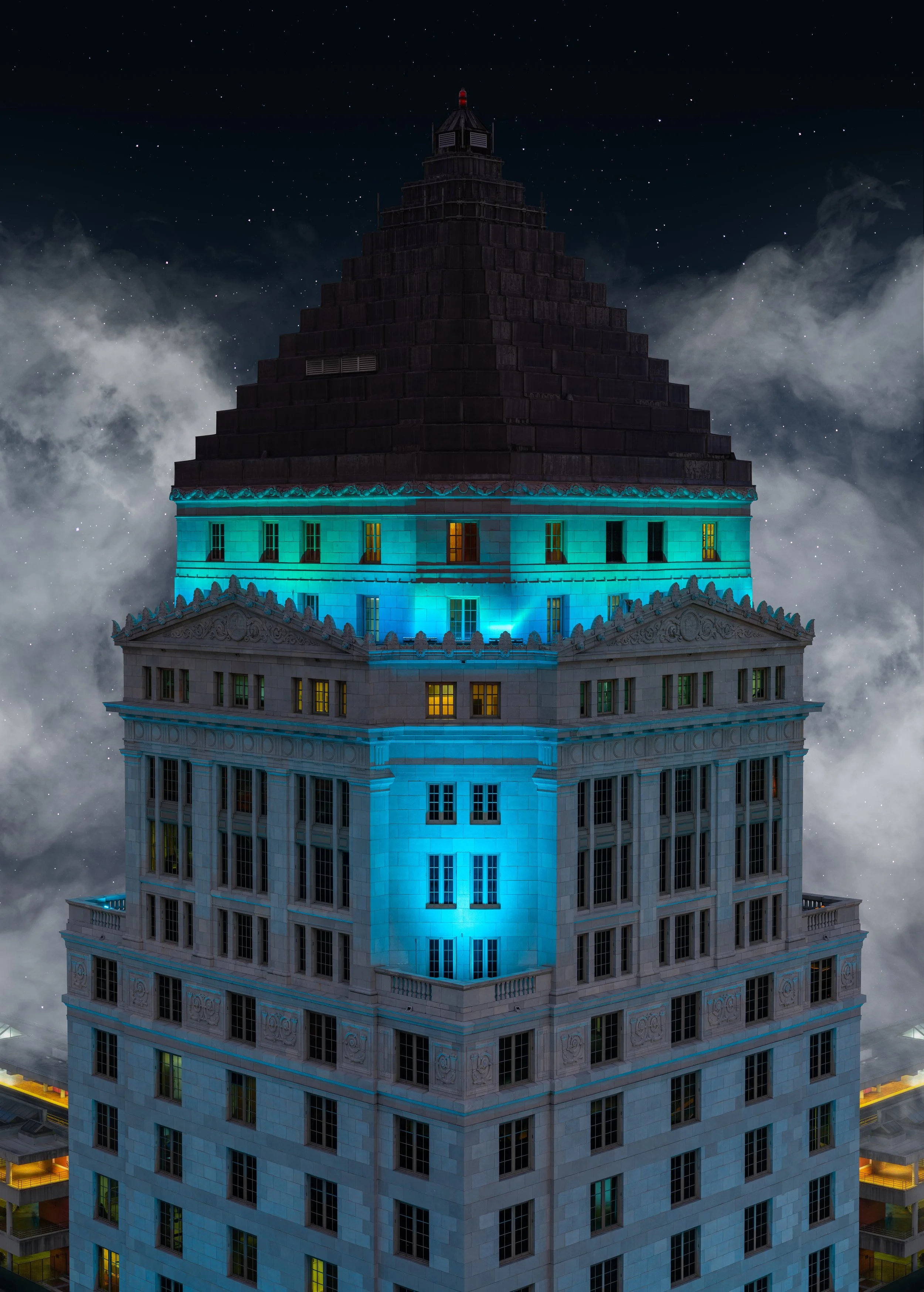 Concealed within the pyramid, three additional scaled-down stories exist as well as a steel-grating access platform below the cupola. These floors contain a telecommunications facility, elevator mechanical room, air conditioning machinery, and two large water tanks.
